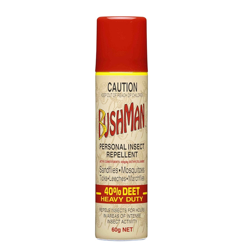 The BUSHMAN 60G AERSOSOL BROWN is a 40% DEET personal insect repellent designed with a light neutral scent. This aerosol provides hours of effective protection from insects such as sand flies, mosquitoes, ticks, leeches and march flies. Active constituent: 40% DEET.