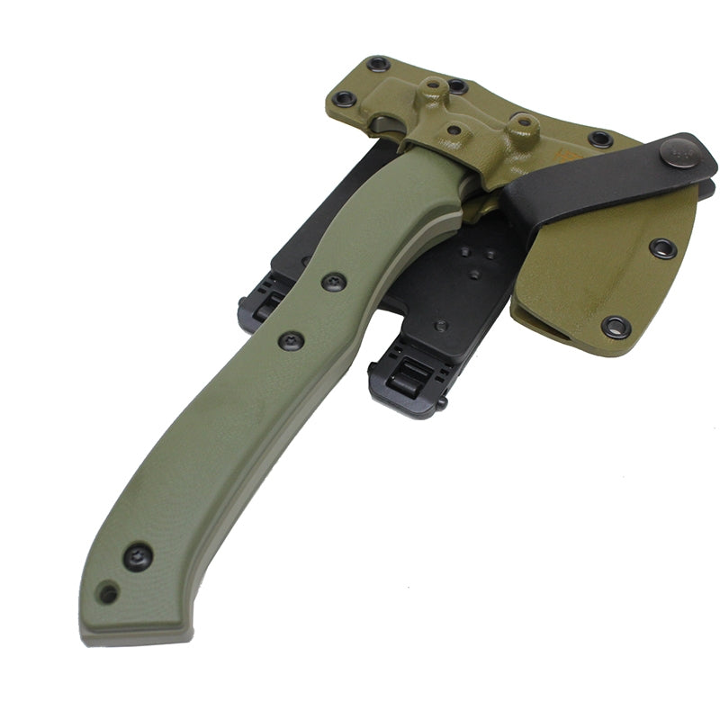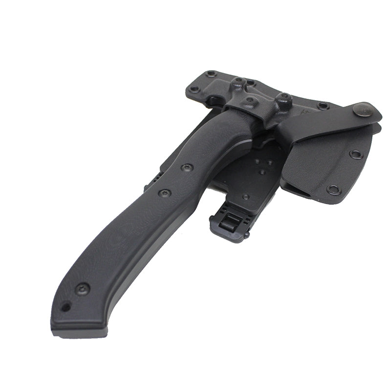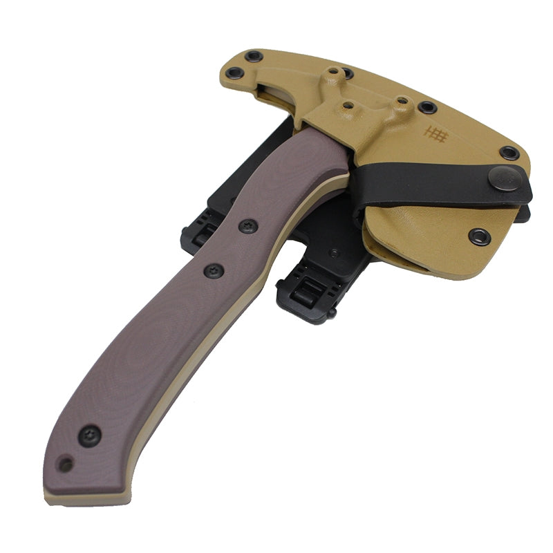 - US made Kydex. HBB believe the carry system supplied with thier tools is as important as the tool it protects. Each sheath is precision molded for secure retention and easy maintenance. A friction lock system holds the axe snugly in its sheath, added retention is offered via a quick release safety strap with press-stud. All CRA sheaths are PALS/MOLLE compatible and come supplied with two primary attachment options including Belt & PALS/MOLLE.