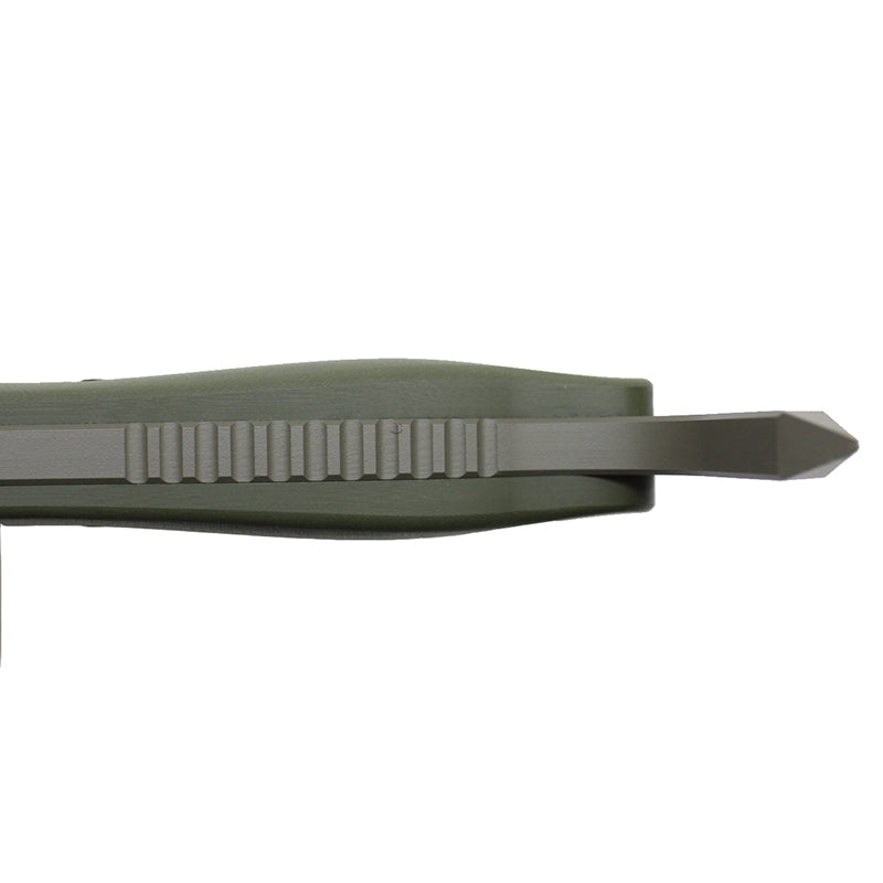 Despite its relatively compact size, the CRA-02 maintains a large cutting head for maximum surface contact and overall functionality. Opposing the sharpened primary edge is a faceted tanto spike, designed for low-range prying, penetration, and material destruction.