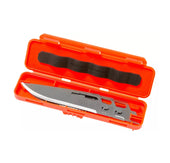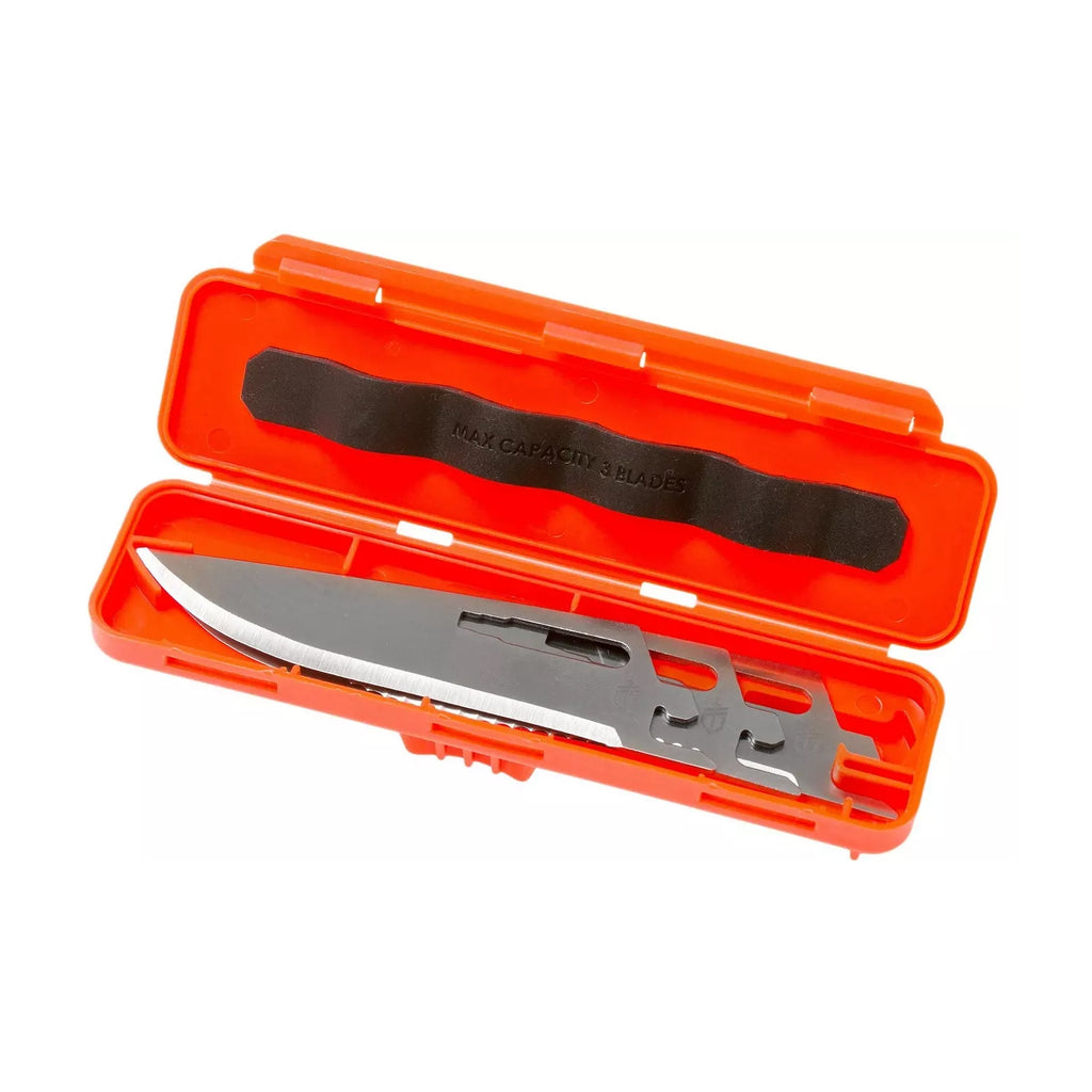 The handle is enhanced with large cut-outs to make sure the weight remains low. Because rubber was used for the handle you will always have enough grip over it. Even in the most humid situations. A piece of reflective plastic was placed above the finger groove. As such you will always be able to find the Gerber Randy Newberg EBS in the dark. Are you planning not to use the knife for a while? If so you can safely store the blades in the box and click the handle on the box.