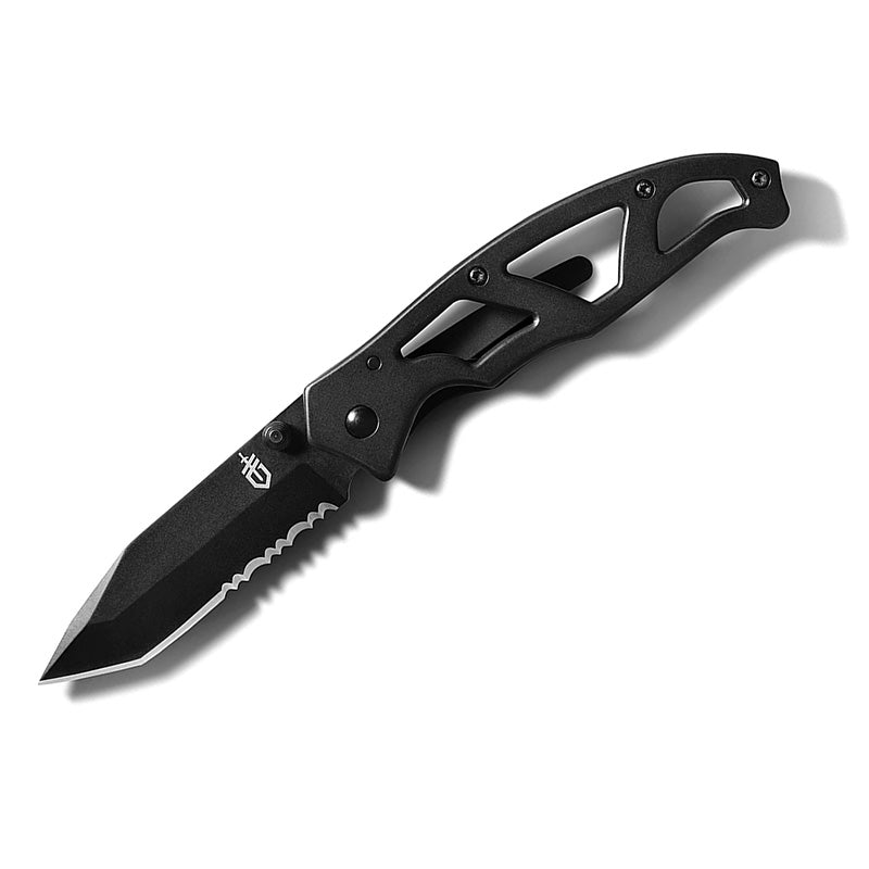 The blade of the Gerber Paraframe Tanto is made from 7C317MoV steel. This type of steel has a black coating to protect it against rust. The edge is partially serrated and perfect when you need to open boxes or cut a piece of rope. The open handle on the Paraframe Tanto is made from stainless 3Cr13 steel and, like the blade, dressed completely in black.