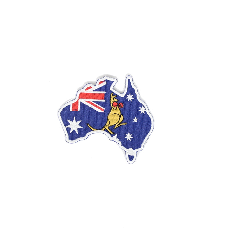 Australia map shaped woven patch with the Australian National flag and a Boxing Kangaroo