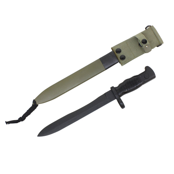 The M1964 bayonet has checkered plastic grips and an unfullered bolo blade. The scabbard has an integral web belt frog. This bayonet has a very unusual rectangular mounting slot. A distinctive CETME Model C bayonet variant with smooth grips and a fullered blade is believed to have been made for export to Guatemala.