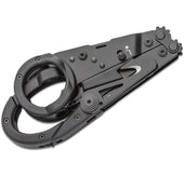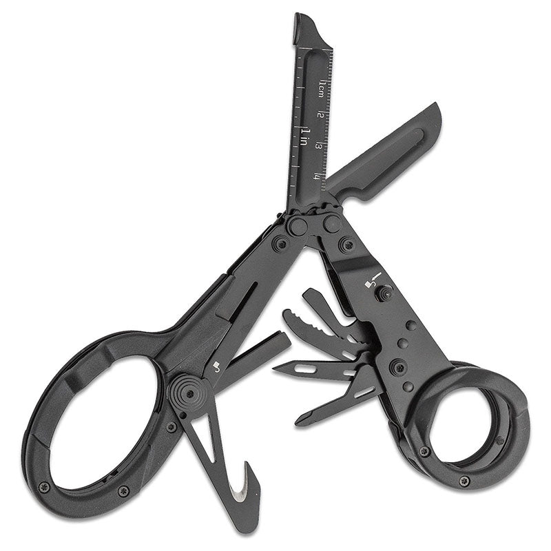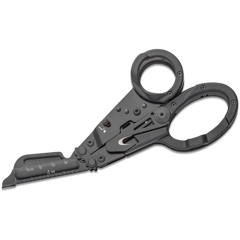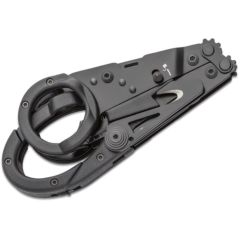 The SOG ParaShears also includes a couple other practical tools. A ruler in both mm and inches, cutting hook, glass breaker, tweezers, philips head screwdriver, bottle opener, flat screwdriver, awl, rope cutter (curved serrated knife), and a key for an oxygen tank. If you are using either of these tools when the pair of scissors is closed it might sometimes feel a little strange holding the ParaShears. Until you realize you can slide your index finger through one of the holes. That is when it will feel natural again. If, for instance, you use the cutting hook you will notice this: it will work amazingly if you slide your finger through the ring.