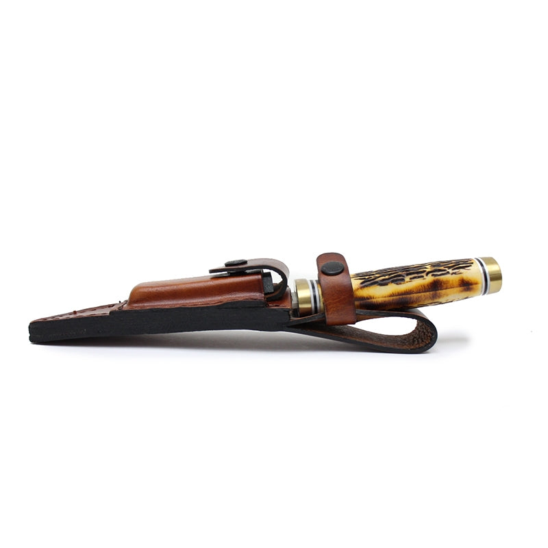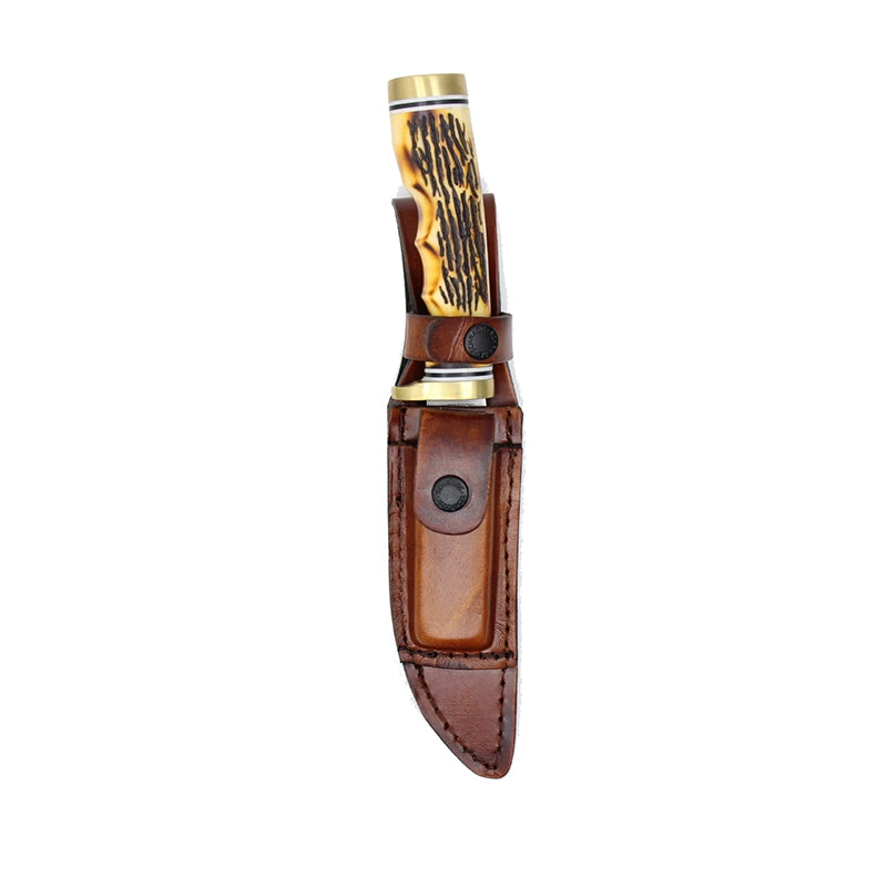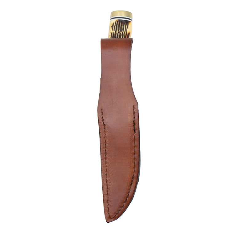 The Uncle Henry 153UH Golden Spike Next Gen features a 4.92 inch trailing point blade made of 7Cr17MoV stainless steel with a satin finish. The Golden Spike Next Gen has next gen Staglon scales (with a more realistic stag look than in years past), a nickel silver guard for secure grip, and a nickel silver bolster. A leather sheath is included.